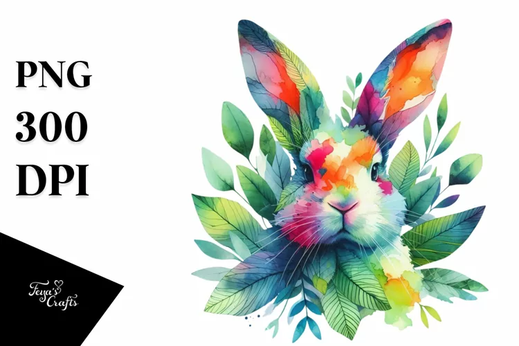 Abstract Vibrant Watercolor Bunny with Leaves JPEG example image 1