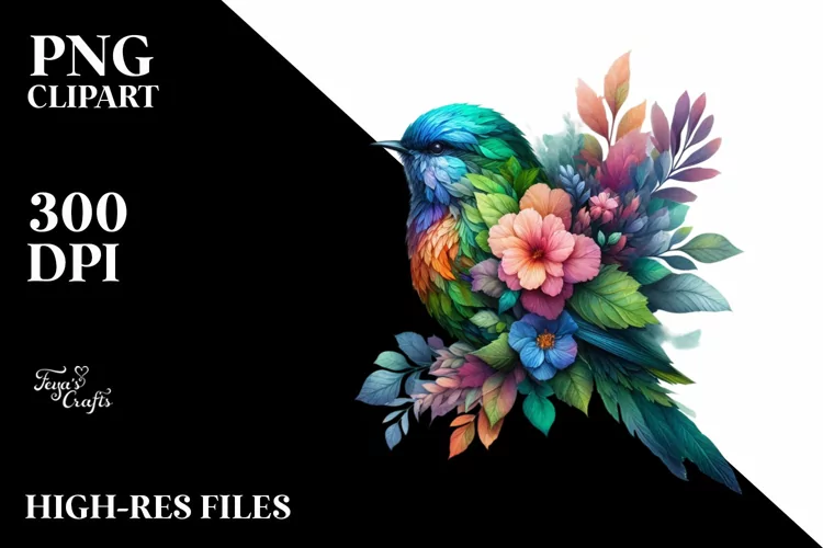 Abstract Vibrant Watercolor Bird with Flowers JPEG