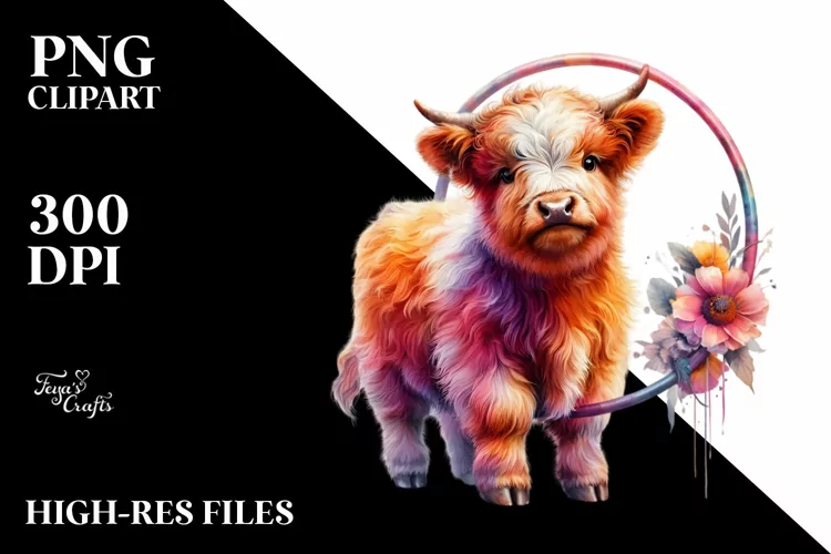 Colorful Baby Highland Cow with Hoop, PNG