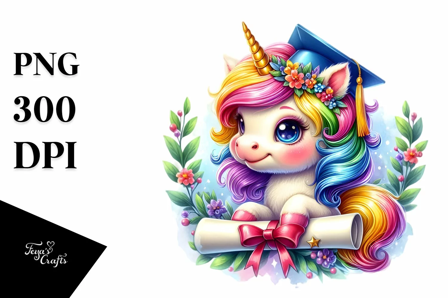 Colorful Baby Unicorn with Diploma PNG example image 1