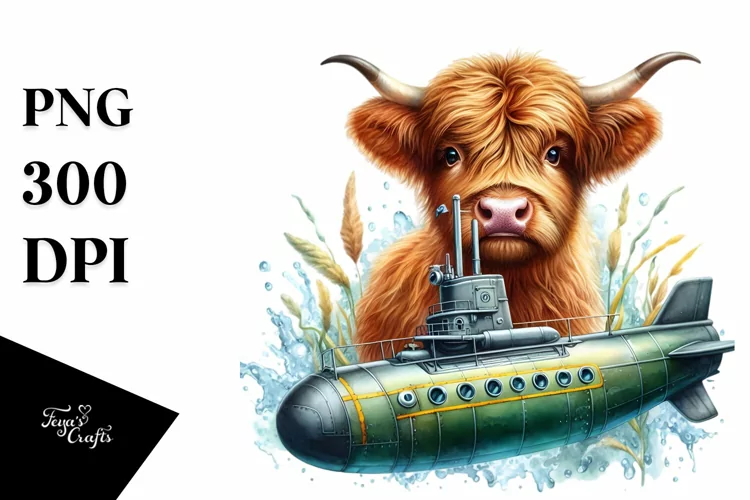 Colorful Baby Highland Cow with Submarine, Transparent PNG example image 1