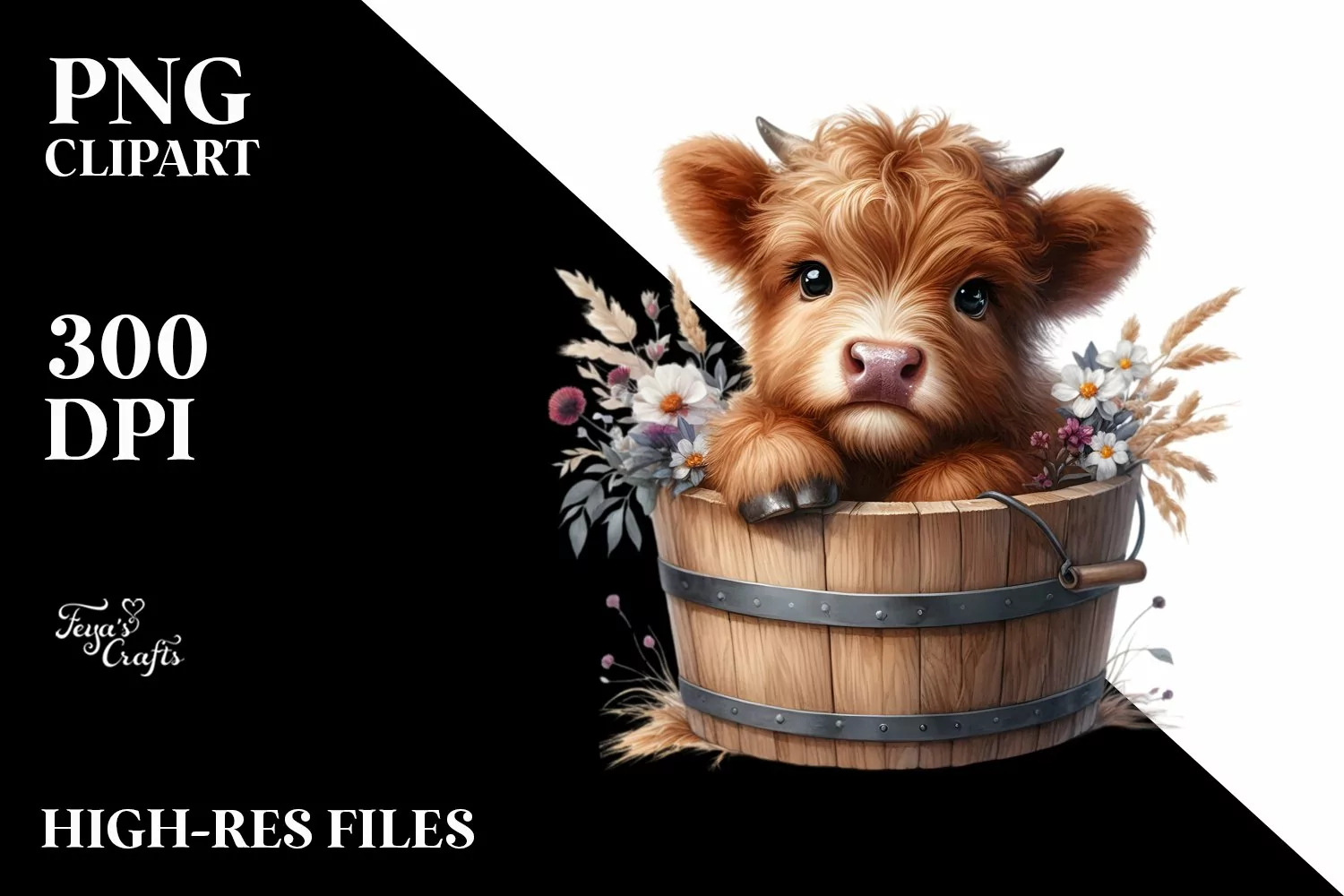 Cute Baby Highland Cow Wood Bucket PNG example image 1