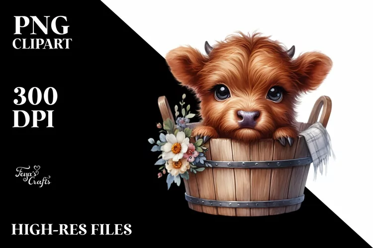 Similar Design Products to Cute Baby Highland Cow with Wood Bucket, PNG