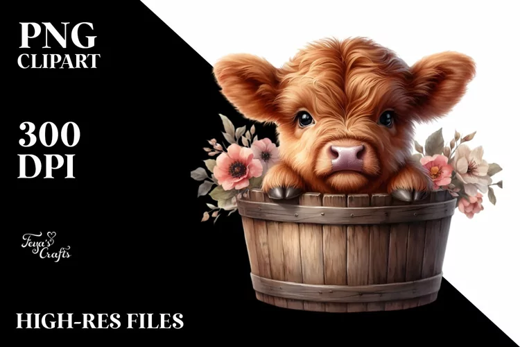 Cute Baby Highland Cow with Wooden Bucket PNG example image 1