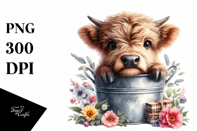 Cute Baby Highland Cow in Bucket PNG example image 1