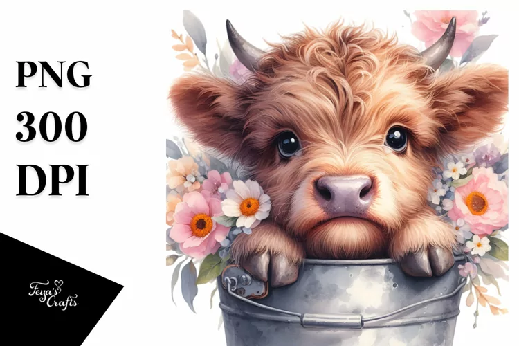 Watercolor Cutebaby Whitebackground Centered Highlandcow Bigeyes Bucketwithflowers