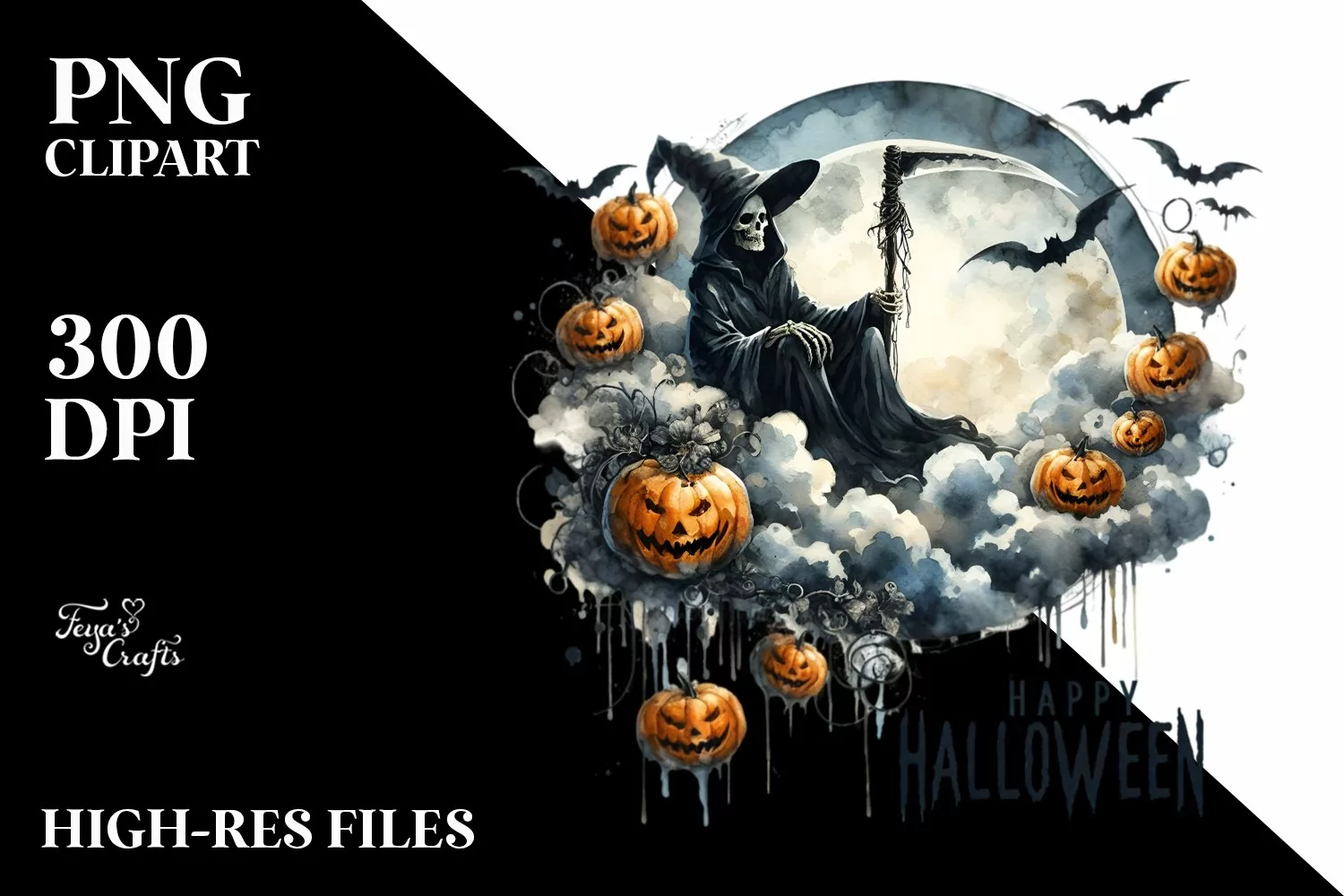 Haloween Sitting Reaper Whitebackground Pumkins Happyhalloween Elementsnottouchingcanvasedges Washerwatercolor