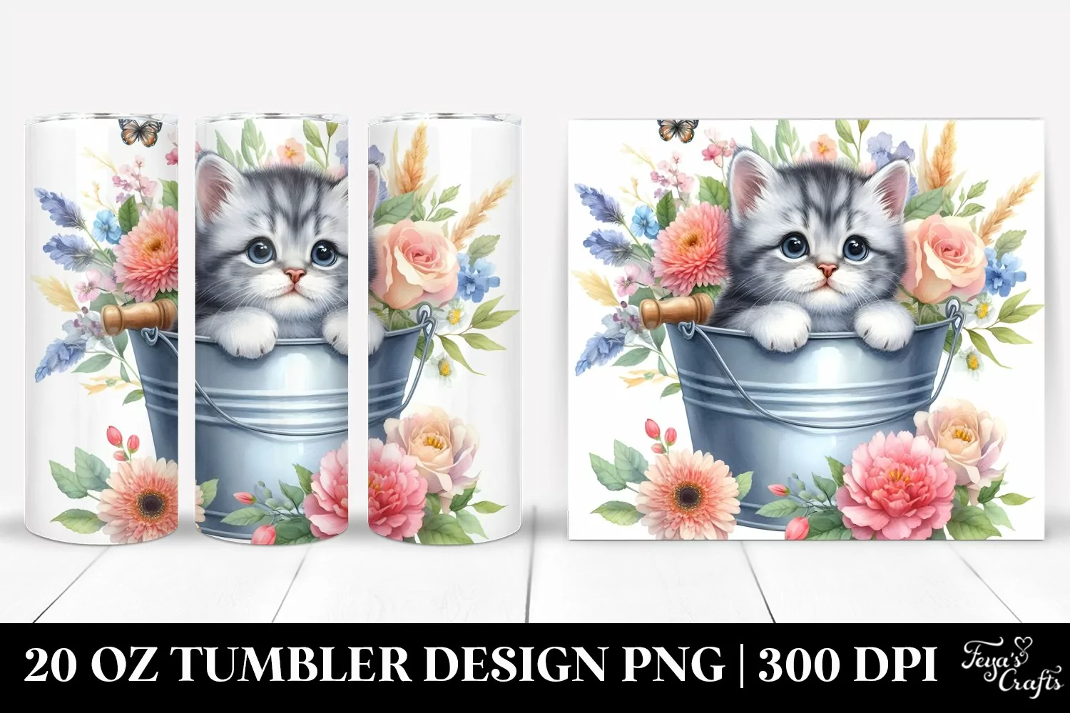 Watercolor Clipart Png Sublimation Tumbler Whitebackground Centered Cutebabycat Bucketflowers