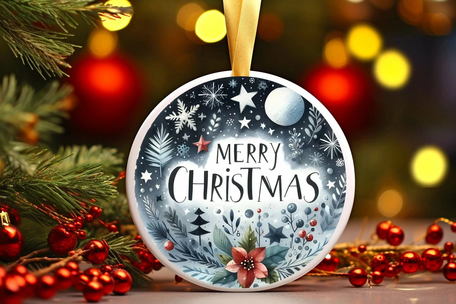 Watercolor Ornament Simple Round Sticker Christmas Winter Png Sublimation Merrychristmas
