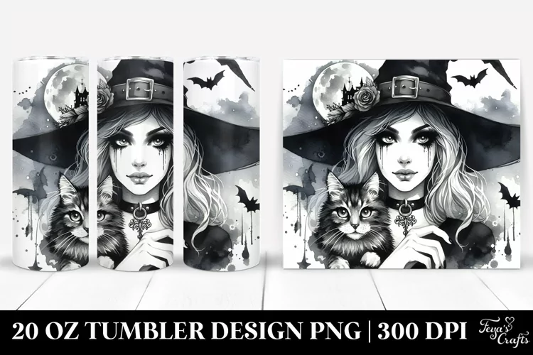 Watercolor Gothic Clipart Witch Png Cat Sublimation Tumbler Whitebackground Centered