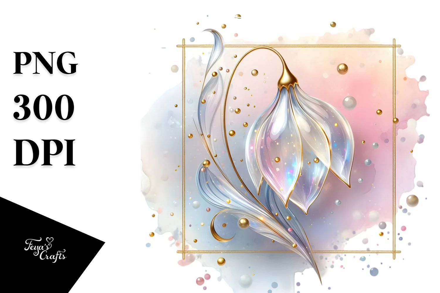 Sticker Summer Flower Png Sublimation Snowdrop Whitebackground Watercolorsplash Glassmaterial Goldeninsertions