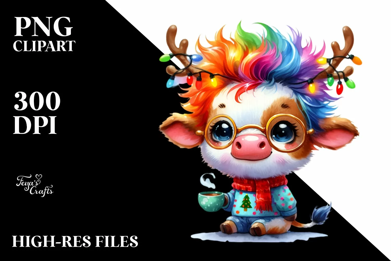 Teacup Whitebackground Enthusiastic Vibrantcolors Watercolorcow Centralfigure Crazyhaircut Reindeerhorns Christmasstreelights