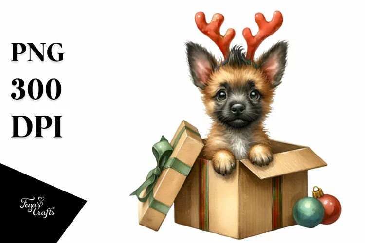 Watercolor Baby Expressive Giftbox Whitebackground Malinois Enthusiastic Centralfigure Crazyhaircut Reindeerhorns