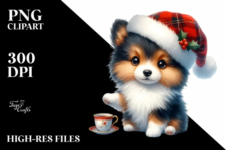 Watercolor Teacup Santahat Coolhaircut Shetlandsheepdog Centralfigure