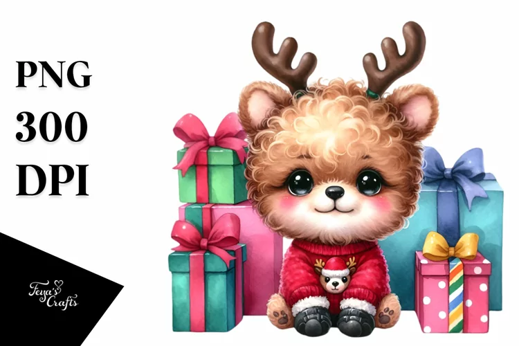 Watercolor Baby Sublimation Whitebackground Giftboxes Vibrantcolors Bichpoo Centralfigure Quirkystyle Reindeerhorns