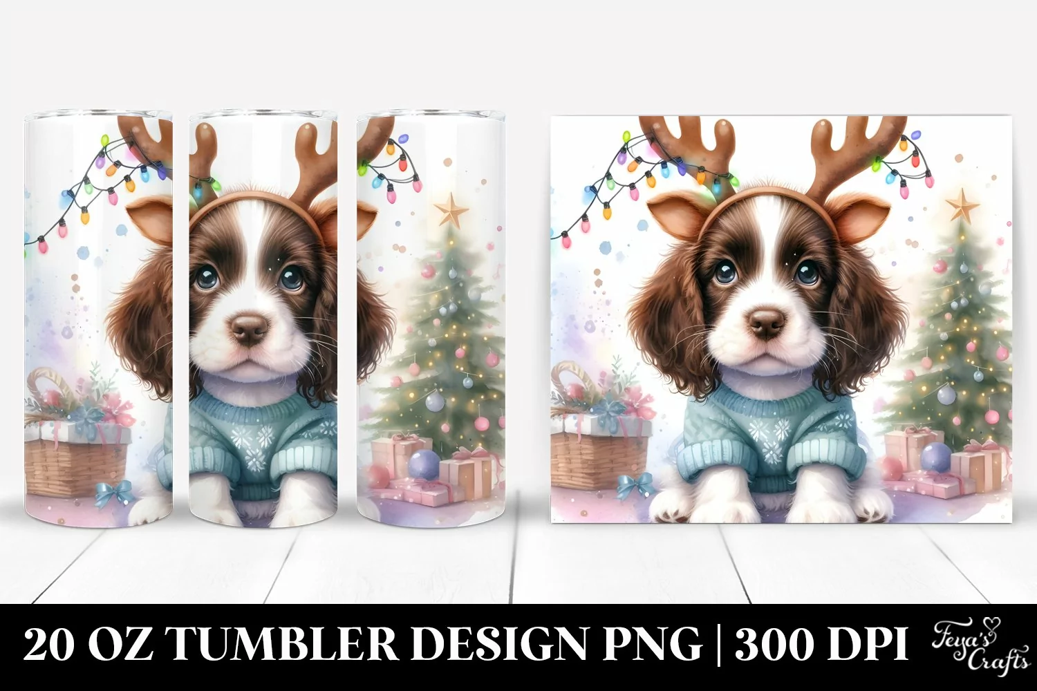 Watercolor Baby Png Sublimation Christmastree Pastelcolors Englishspringerspaniel Expressiveface Reindeerhorns
