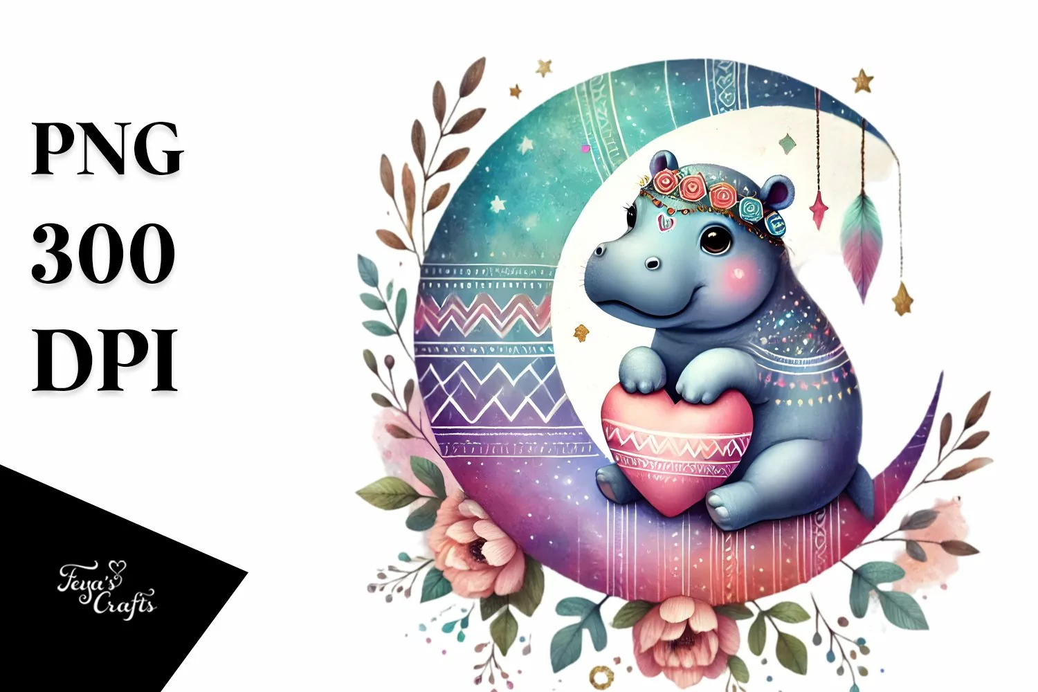 Big Painting Flower Heart Digital Boho Sitting Pastel Hippo