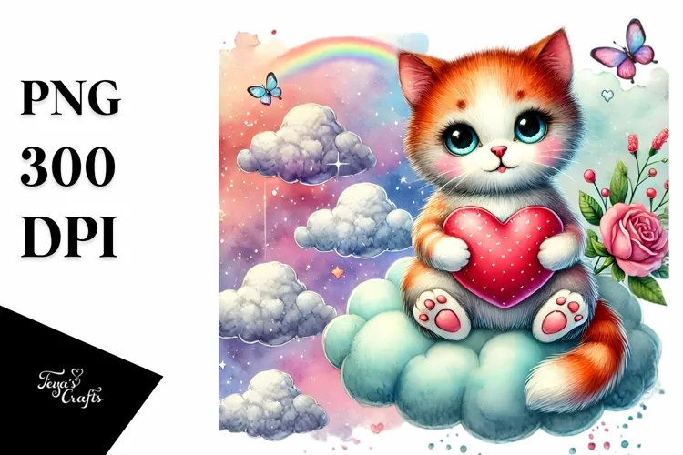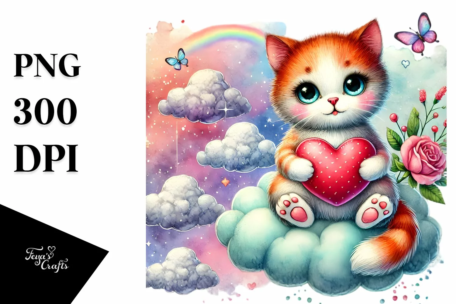 Colorful Cat Heart Sitting on Cloud, PNG example image 1