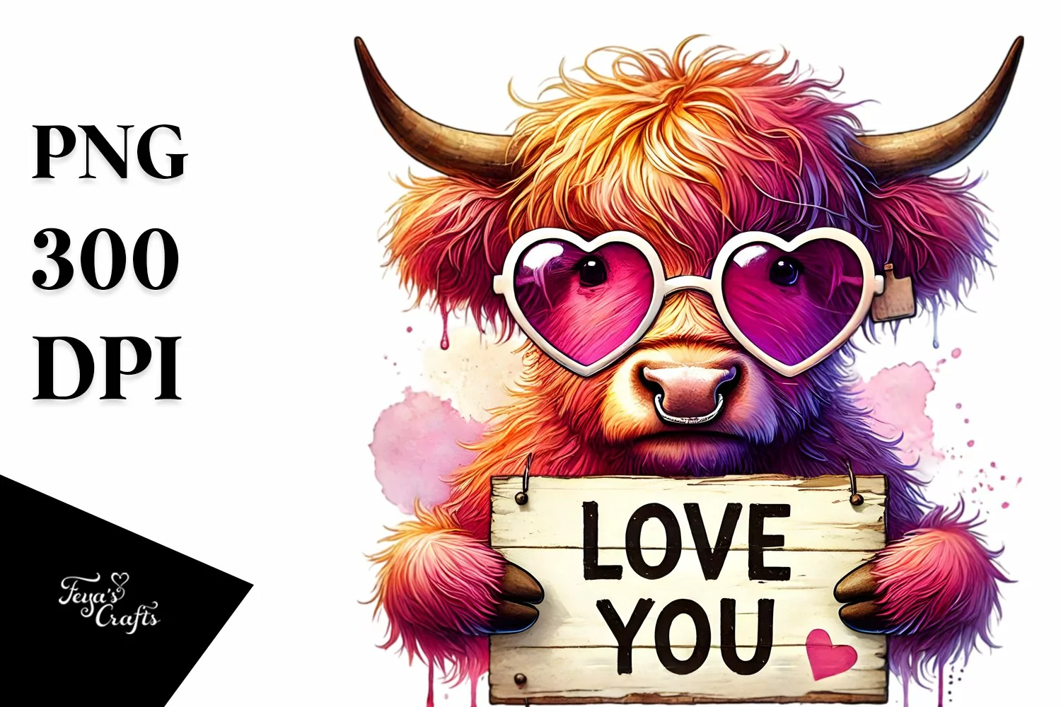 Similar Design Products to Pink Highland Cow with Love You Sign, PNG
