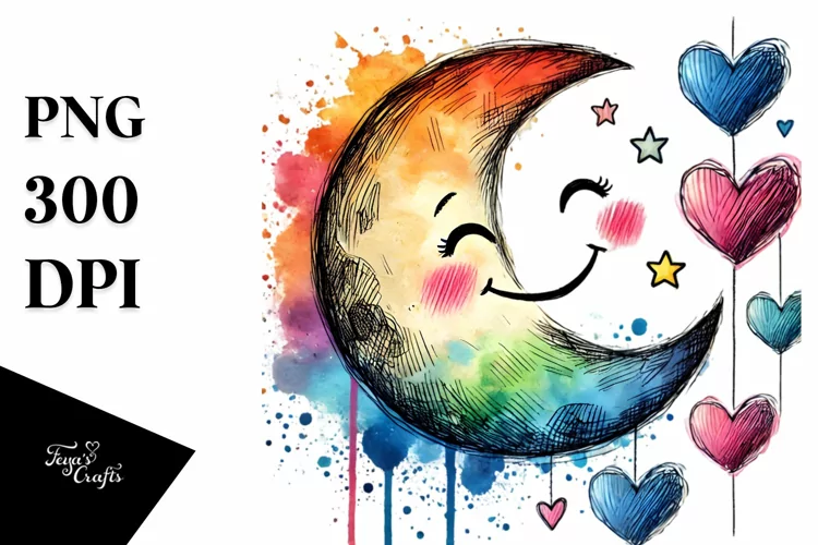 Smiling Scribbled Moon with Hearts Watercolor PNG example image 1