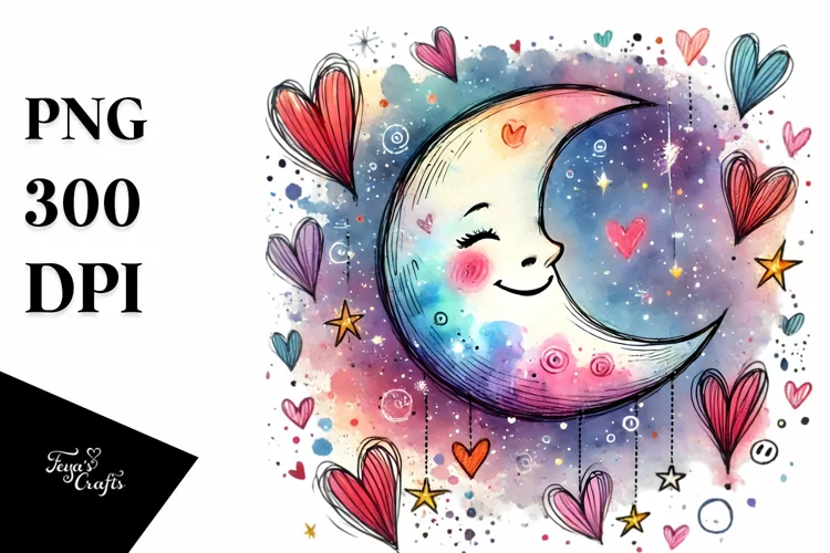 Smiling Scribbled Moon with Hearts Watercolor PNG example image 1