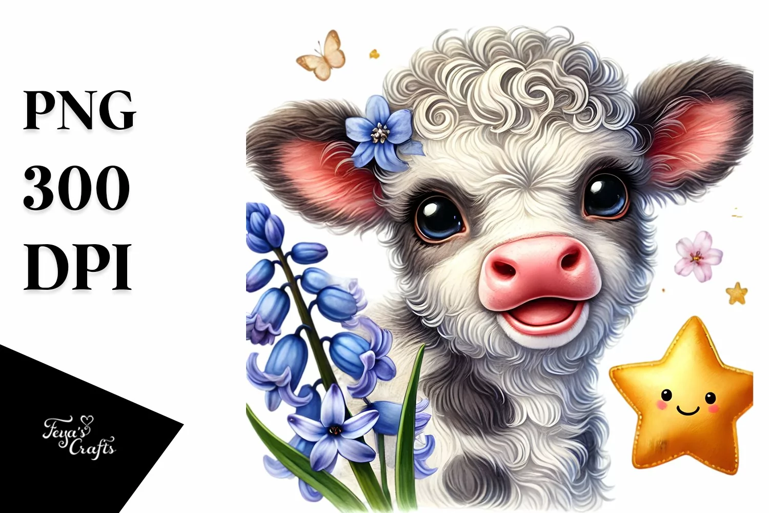 Cute Baby Highland Cow with Hyacinth PNG example image 1