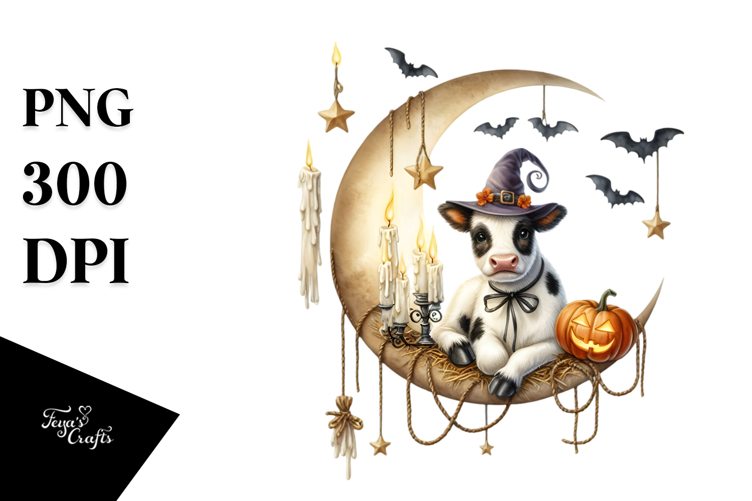 Cow Dressed for Halloween on Half Moon PNG example image 1