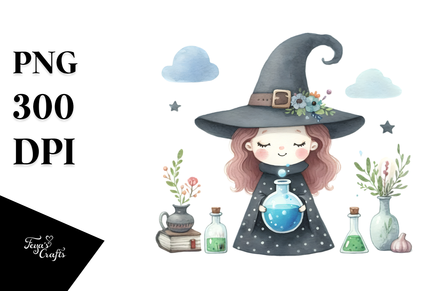 Simple Watercolor Retro Funny Witch PNG example image 1