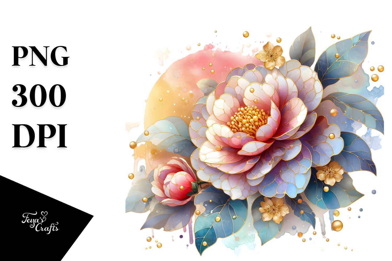 Watercolor Sticker Summer Flower Golden Png Glass Sublimation Camellia