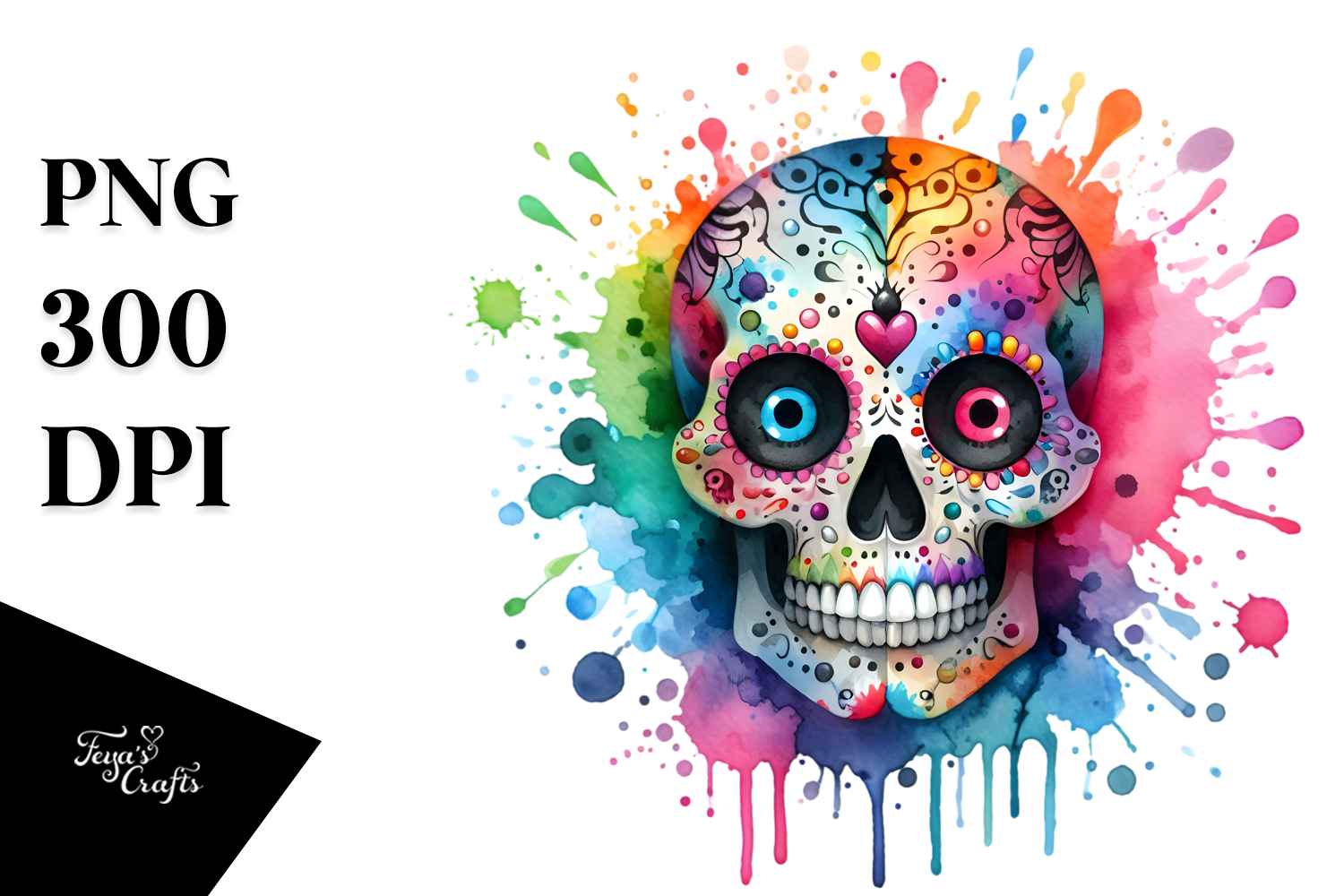 Watercolor Painting Skull Colorful Splashes White Grungy Sublimation