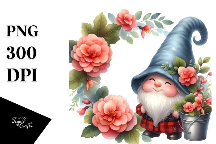 Watercolor Cute GNOME with Floral Frame, PNG