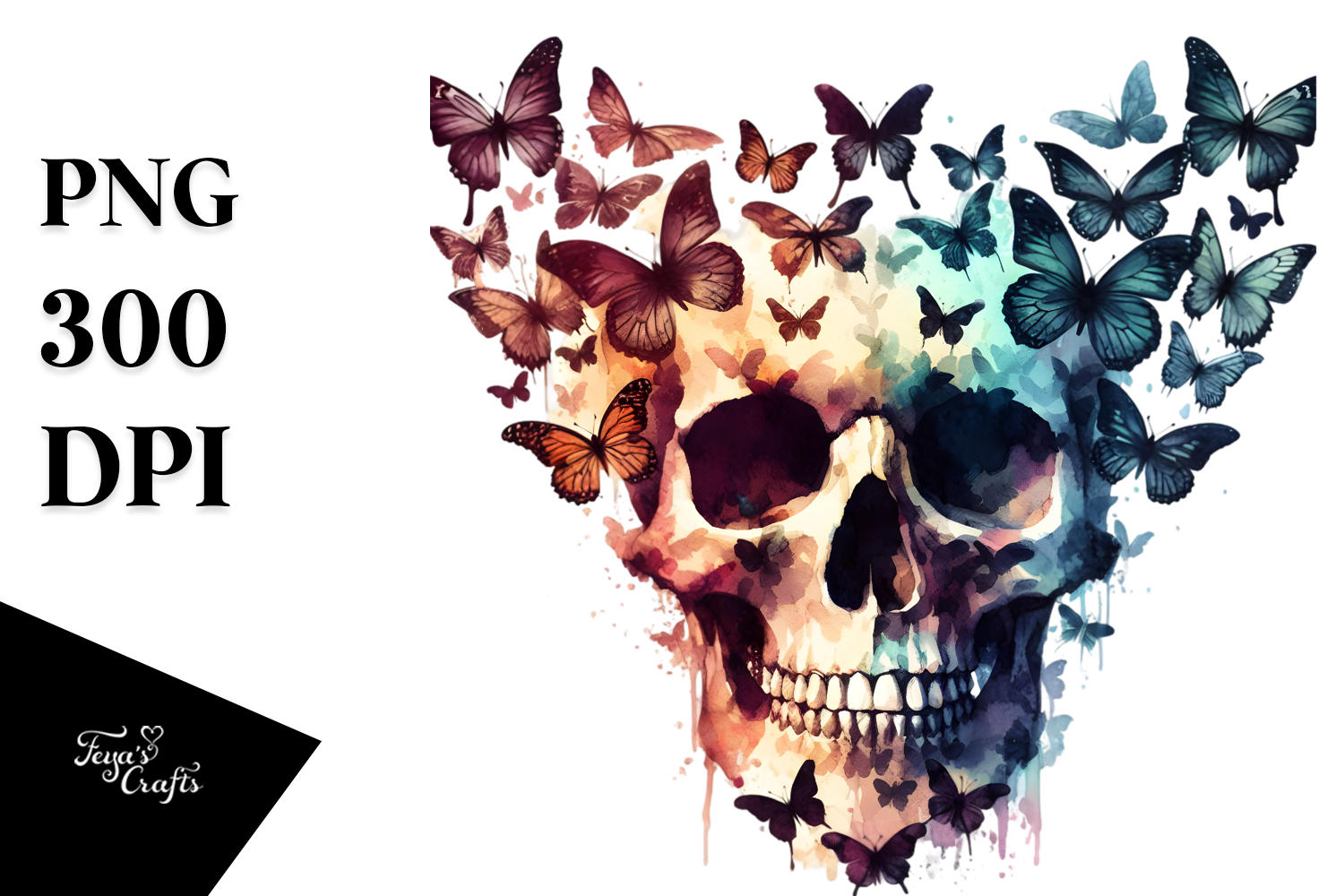Watercolor Painting Skull Colorful Grungy Butterflies Whitebackground