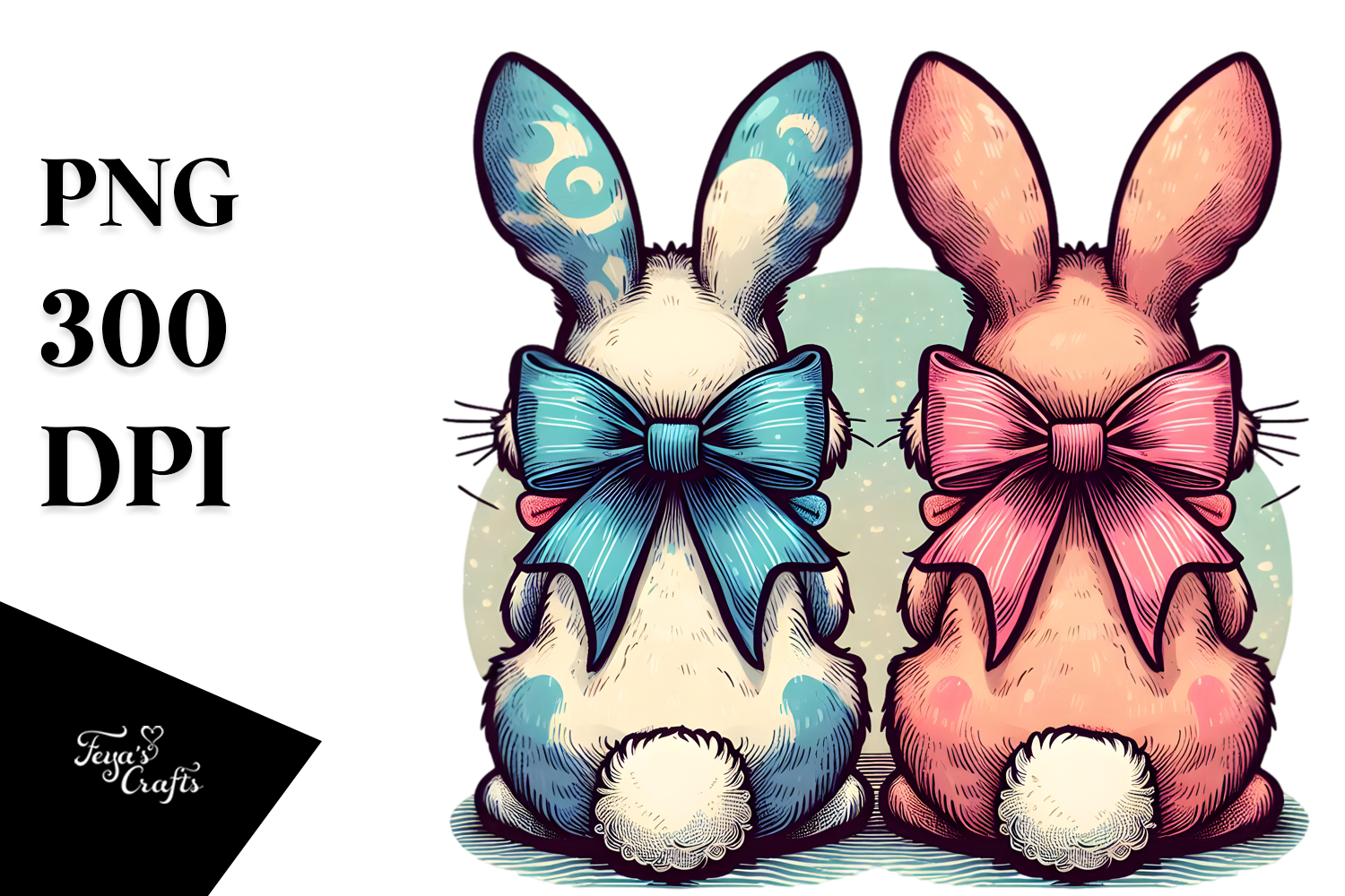 Colorful Vintage Bunnies Sitting View from Back with Bow, example image 1