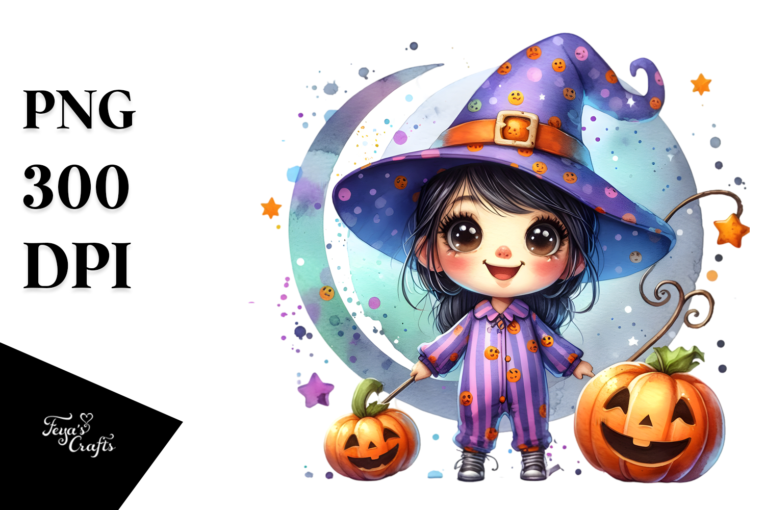 Funny Adorable Witch with Pumpkins PNG example image 1