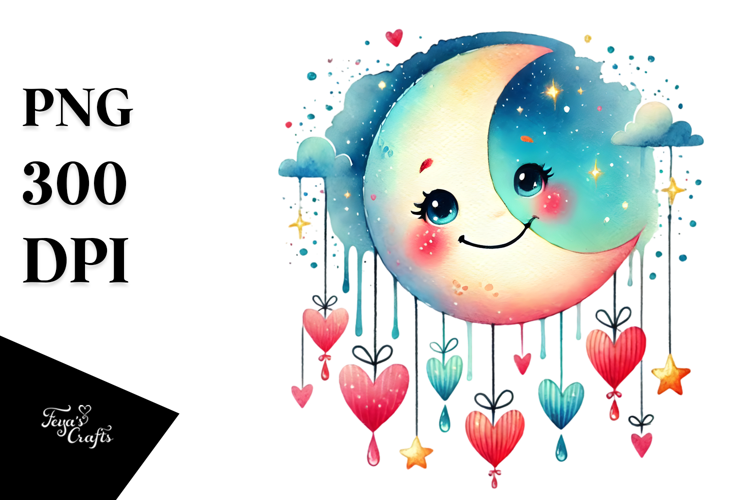 Colorful Smiling Moon with Hearts, Watercolor PNG example image 1