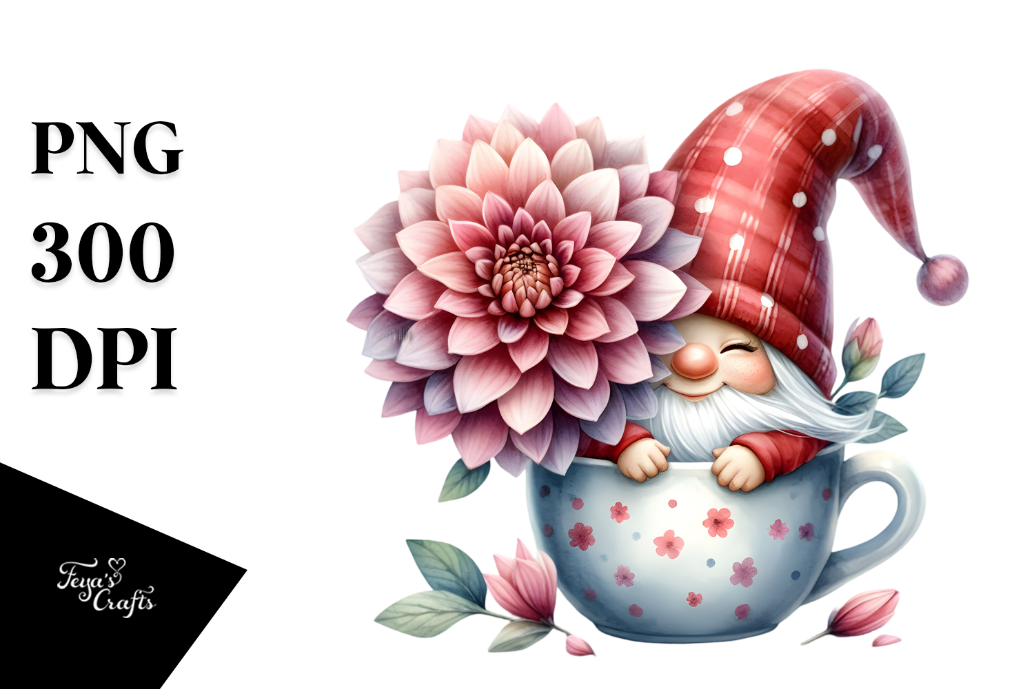 Cute Gnome with Dahlia Floral Cup PNG example image 1