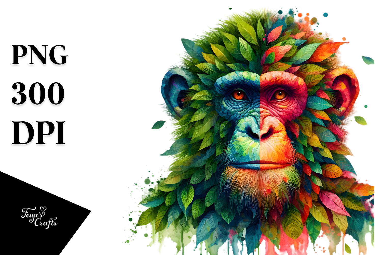 Vibrant Watercolor Monkey made of Plant Leaves PNG example image 1