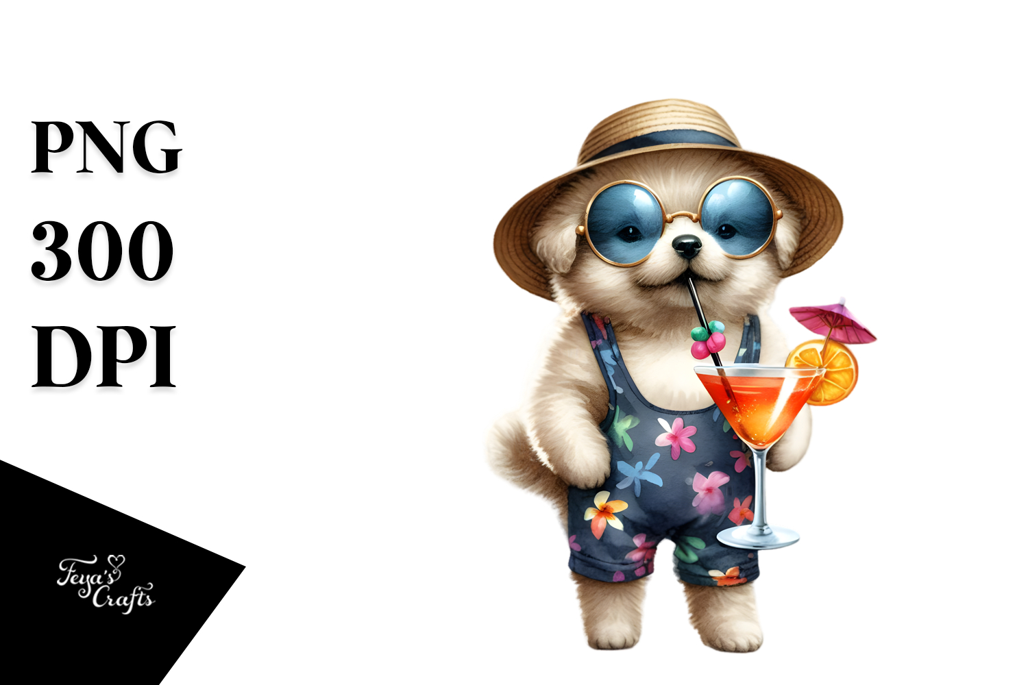 Watercolor Painting Puppy Whitebackground Beachwear Cloudofdust Drinkingacocktail Funkylooking Goldfoilcirclebackground