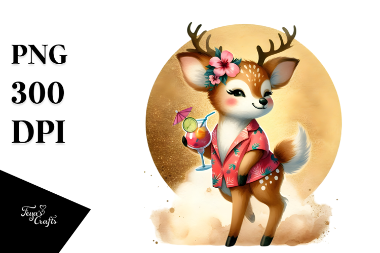 Cute Deer in Beachwear with Cocktail, Watercolor PNG example image 1