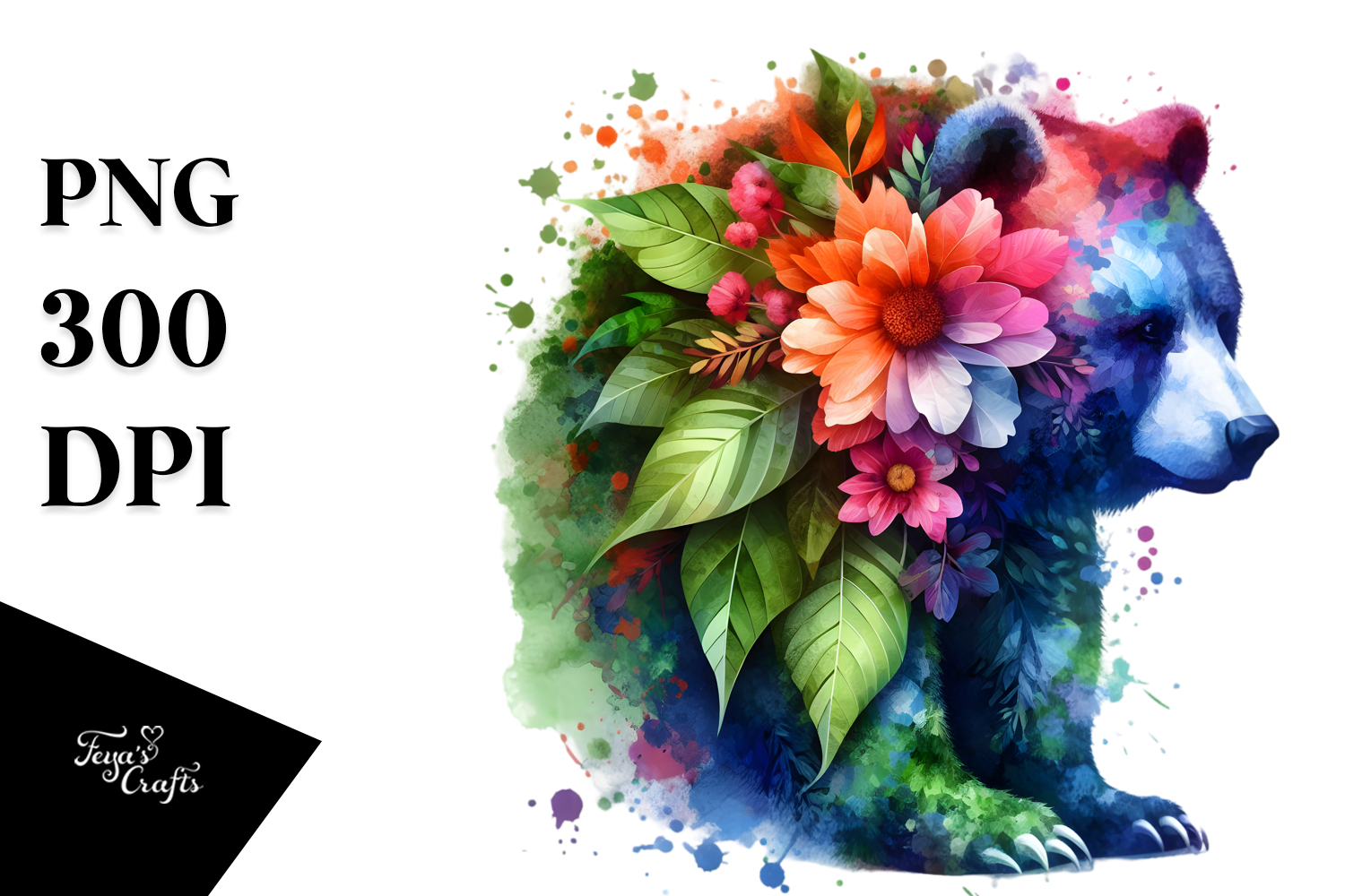 Watercolor Flowers Bear Abstract Vibrant Halfbody Plantleaves
