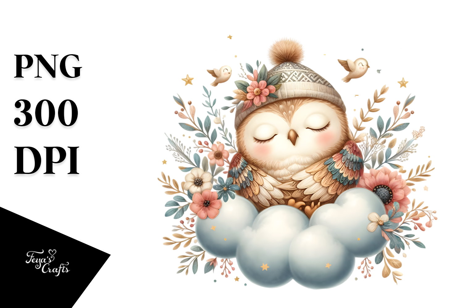 Watercolor Summer Cute Baby Owl Cloud Whitebackground Centered Floralornament