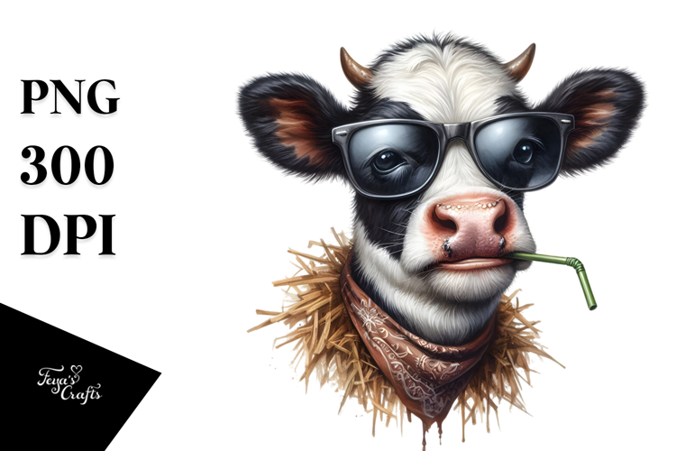 Funny Baby Cow with Sunglasses Watercolor example image 1