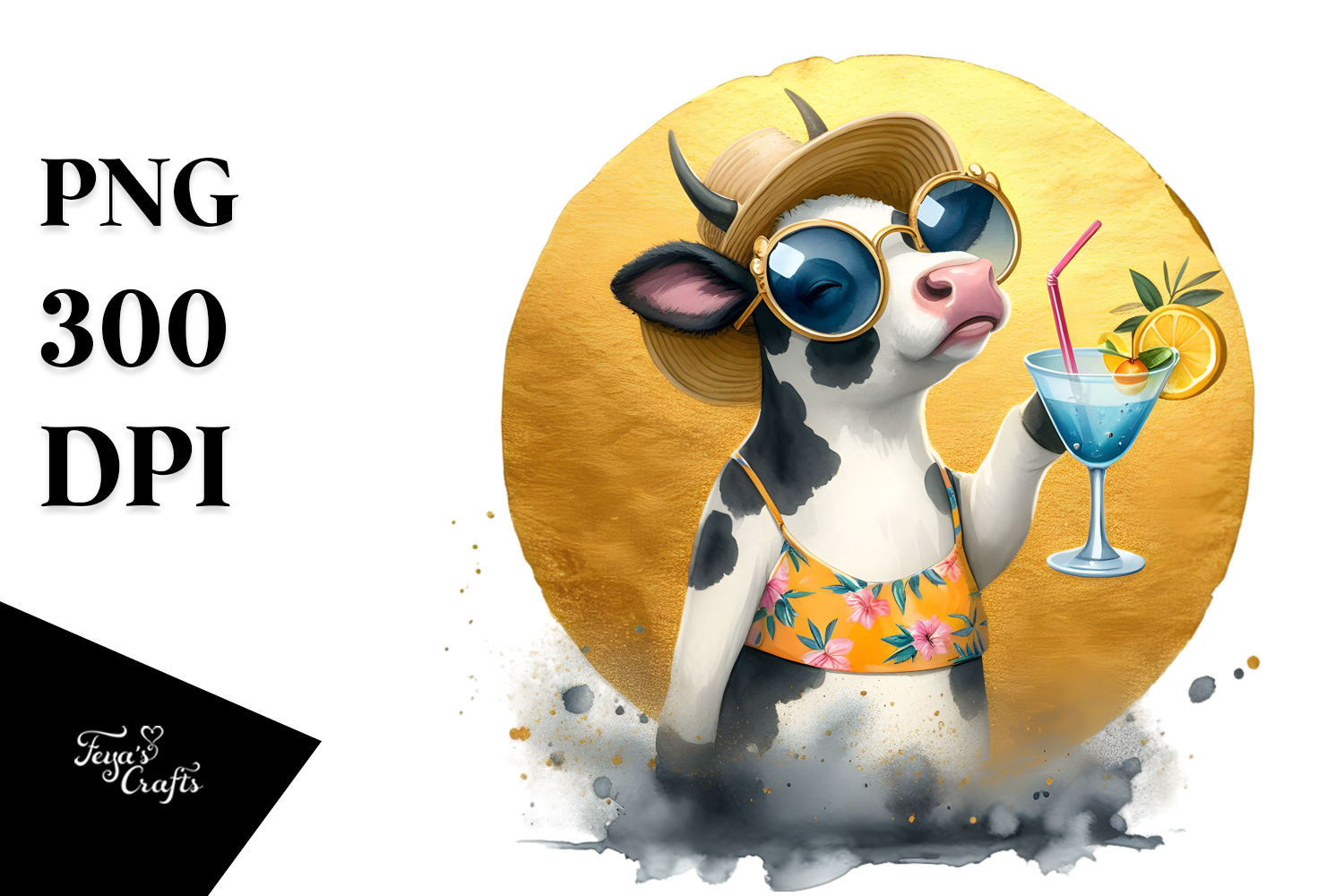 Cow in Beachwear Drinking Cocktail PNG example image 1