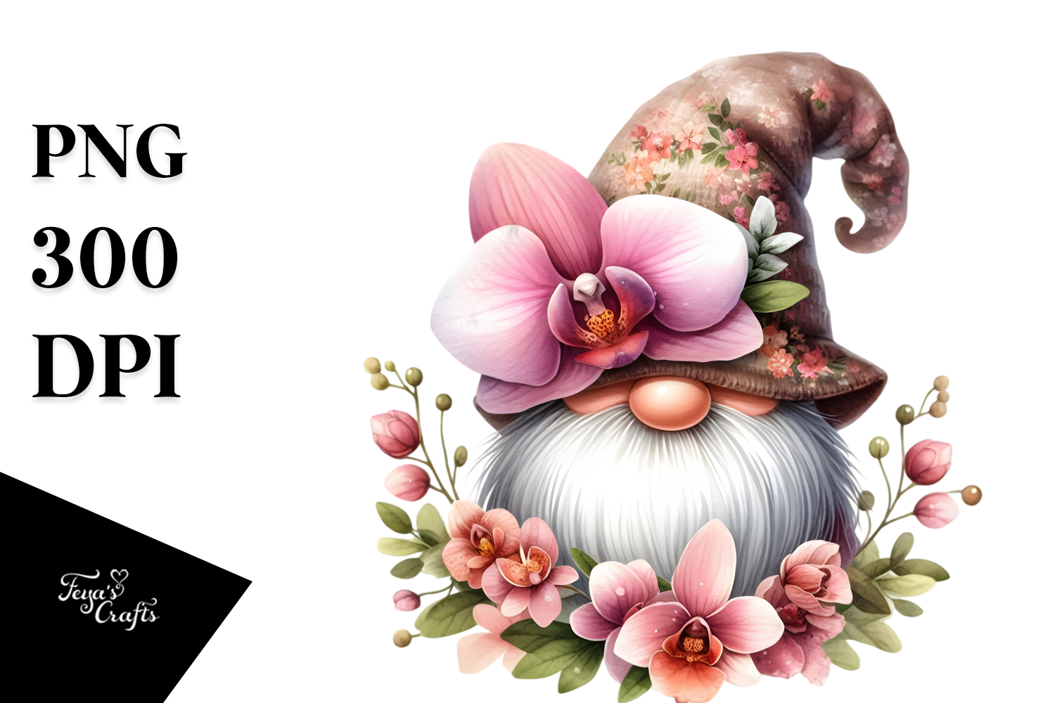 Cute Gnome with Orchid Floral Frame, PNG example image 1