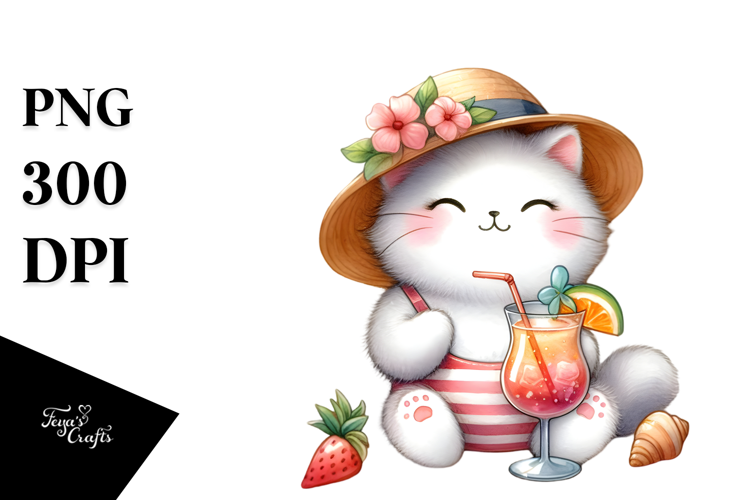 Happy Cat in Beachwear Drinking Cocktail PNG example image 1