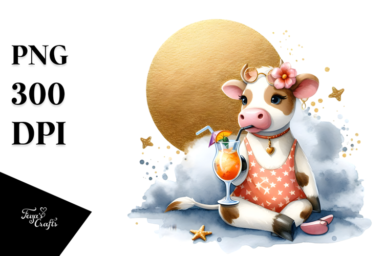 Watercolor Cute Painting Cocktail Cow Whitebackground Beachwear Goldfoil Cloudofdust