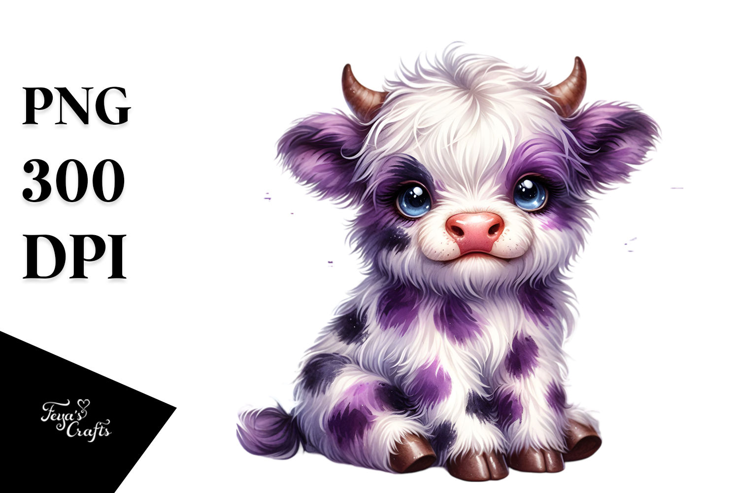 Cute Watercolor Baby Highland Cow, Star Background PNG example image 1