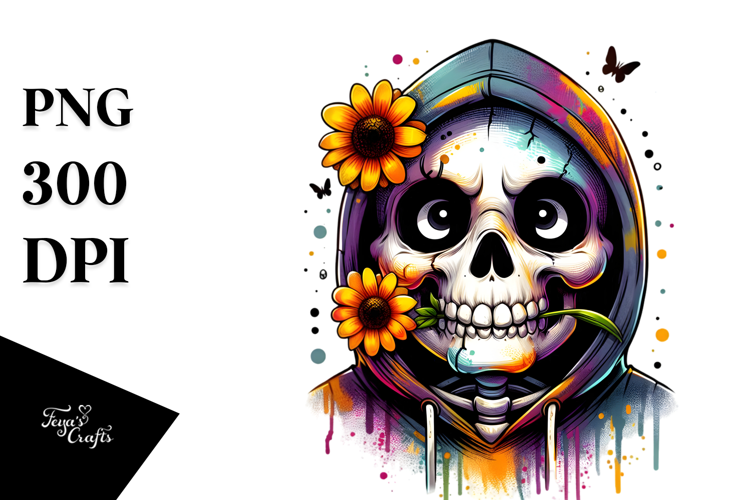 Funny Design Skeleton Watercoloreffect Bigeyes Flowerinmouth Goofyface Spookyhoodie Cartoonishproportions