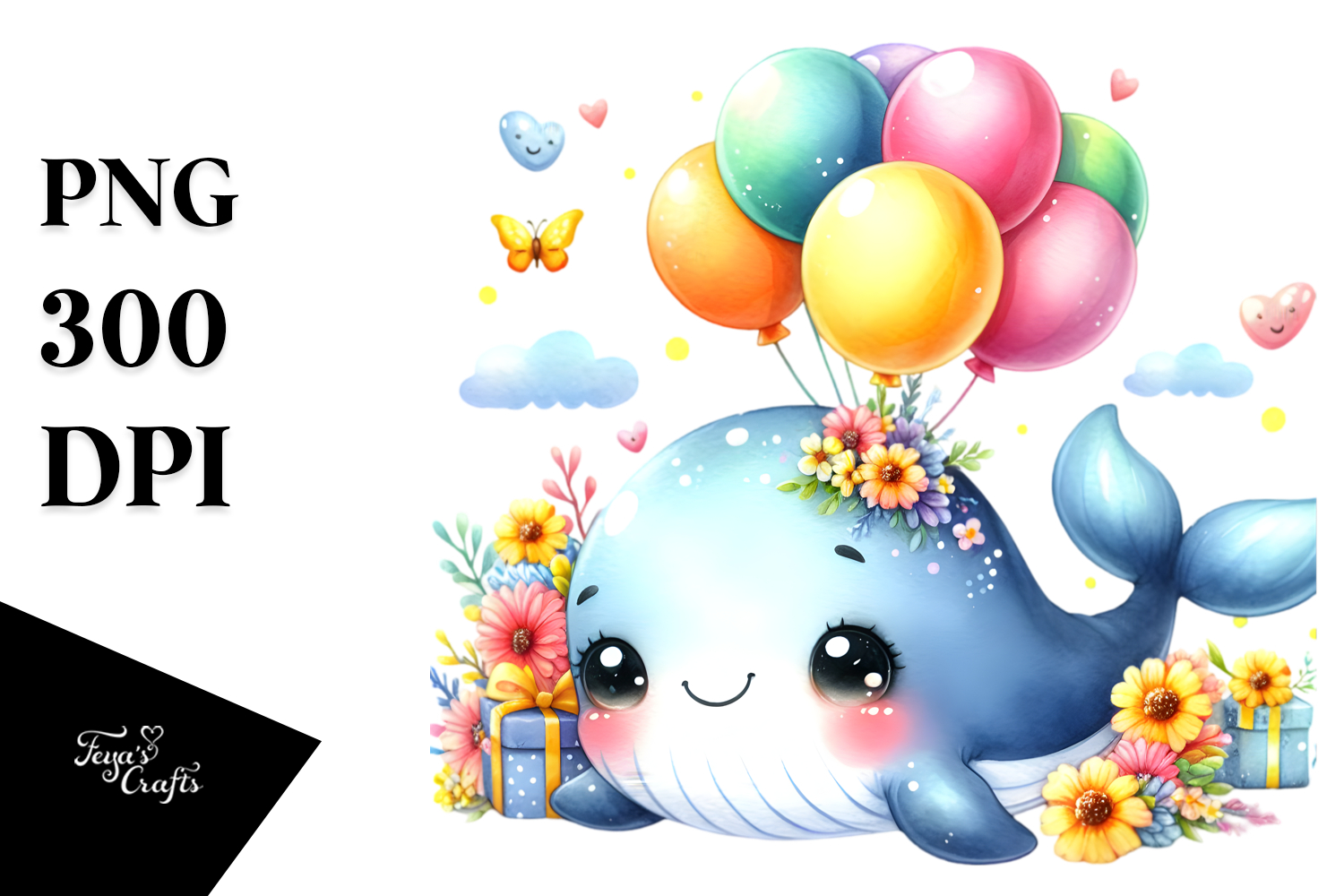 Colorful Baby Whale with Balloons | Sublimation Clipart example image 1