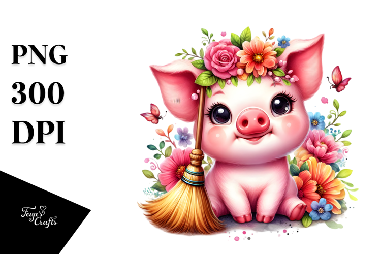 Similar Design Products to Baby Pig with Flowers and Broom Drawing | Clipart